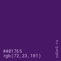 Цвет #481765 в цветовой модели RGB обозначается тремя октетами (72, 23, 101) в десятичном формате и #481765 в шестнадцатиричном (hex) формате, которые являются интенсивностью красного 72 (hex 48), интенсивность зелёного 23 (hex 17) и интенсивность синего 101 (hex 65).