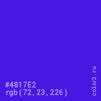 Цвет #4817E2 в цветовой модели RGB обозначается тремя октетами (72, 23, 226) в десятичном формате и #4817E2 в шестнадцатиричном (hex) формате, которые являются интенсивностью красного 72 (hex 48), интенсивность зелёного 23 (hex 17) и интенсивность синего 226 (hex E2).