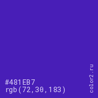 Цвет #481EB7 в цветовой модели RGB обозначается тремя октетами (72, 30, 183) в десятичном формате и #481EB7 в шестнадцатиричном (hex) формате, которые являются интенсивностью красного 72 (hex 48), интенсивность зелёного 30 (hex 1E) и интенсивность синего 183 (hex B7).