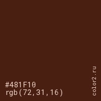 Цвет #481F10 в цветовой модели RGB обозначается тремя октетами (72, 31, 16) в десятичном формате и #481F10 в шестнадцатиричном (hex) формате, которые являются интенсивностью красного 72 (hex 48), интенсивность зелёного 31 (hex 1F) и интенсивность синего 16 (hex 10).