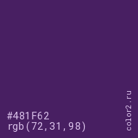 Цвет #481F62 в цветовой модели RGB обозначается тремя октетами (72, 31, 98) в десятичном формате и #481F62 в шестнадцатиричном (hex) формате, которые являются интенсивностью красного 72 (hex 48), интенсивность зелёного 31 (hex 1F) и интенсивность синего 98 (hex 62).