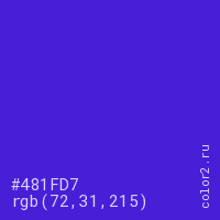 Цвет #481FD7 в цветовой модели RGB обозначается тремя октетами (72, 31, 215) в десятичном формате и #481FD7 в шестнадцатиричном (hex) формате, которые являются интенсивностью красного 72 (hex 48), интенсивность зелёного 31 (hex 1F) и интенсивность синего 215 (hex D7).