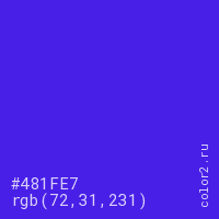 Цвет #481FE7 в цветовой модели RGB обозначается тремя октетами (72, 31, 231) в десятичном формате и #481FE7 в шестнадцатиричном (hex) формате, которые являются интенсивностью красного 72 (hex 48), интенсивность зелёного 31 (hex 1F) и интенсивность синего 231 (hex E7).