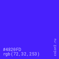 Цвет #4820FD в цветовой модели RGB обозначается тремя октетами (72, 32, 253) в десятичном формате и #4820FD в шестнадцатиричном (hex) формате, которые являются интенсивностью красного 72 (hex 48), интенсивность зелёного 32 (hex 20) и интенсивность синего 253 (hex FD).