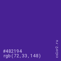 Цвет #482194 в цветовой модели RGB обозначается тремя октетами (72, 33, 148) в десятичном формате и #482194 в шестнадцатиричном (hex) формате, которые являются интенсивностью красного 72 (hex 48), интенсивность зелёного 33 (hex 21) и интенсивность синего 148 (hex 94).