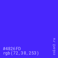 Цвет #4826FD в цветовой модели RGB обозначается тремя октетами (72, 38, 253) в десятичном формате и #4826FD в шестнадцатиричном (hex) формате, которые являются интенсивностью красного 72 (hex 48), интенсивность зелёного 38 (hex 26) и интенсивность синего 253 (hex FD).
