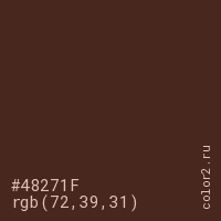 Цвет #48271F в цветовой модели RGB обозначается тремя октетами (72, 39, 31) в десятичном формате и #48271F в шестнадцатиричном (hex) формате, которые являются интенсивностью красного 72 (hex 48), интенсивность зелёного 39 (hex 27) и интенсивность синего 31 (hex 1F).