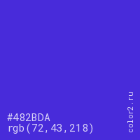 Цвет #482BDA в цветовой модели RGB обозначается тремя октетами (72, 43, 218) в десятичном формате и #482BDA в шестнадцатиричном (hex) формате, которые являются интенсивностью красного 72 (hex 48), интенсивность зелёного 43 (hex 2B) и интенсивность синего 218 (hex DA).