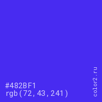 Цвет #482BF1 в цветовой модели RGB обозначается тремя октетами (72, 43, 241) в десятичном формате и #482BF1 в шестнадцатиричном (hex) формате, которые являются интенсивностью красного 72 (hex 48), интенсивность зелёного 43 (hex 2B) и интенсивность синего 241 (hex F1).