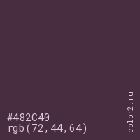 Цвет #482C40 в цветовой модели RGB обозначается тремя октетами (72, 44, 64) в десятичном формате и #482C40 в шестнадцатиричном (hex) формате, которые являются интенсивностью красного 72 (hex 48), интенсивность зелёного 44 (hex 2C) и интенсивность синего 64 (hex 40).