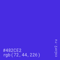 Цвет #482CE2 в цветовой модели RGB обозначается тремя октетами (72, 44, 226) в десятичном формате и #482CE2 в шестнадцатиричном (hex) формате, которые являются интенсивностью красного 72 (hex 48), интенсивность зелёного 44 (hex 2C) и интенсивность синего 226 (hex E2).