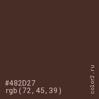 Цвет #482D27 в цветовой модели RGB обозначается тремя октетами (72, 45, 39) в десятичном формате и #482D27 в шестнадцатиричном (hex) формате, которые являются интенсивностью красного 72 (hex 48), интенсивность зелёного 45 (hex 2D) и интенсивность синего 39 (hex 27).
