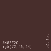 Цвет #482E2C в цветовой модели RGB обозначается тремя октетами (72, 46, 44) в десятичном формате и #482E2C в шестнадцатиричном (hex) формате, которые являются интенсивностью красного 72 (hex 48), интенсивность зелёного 46 (hex 2E) и интенсивность синего 44 (hex 2C).