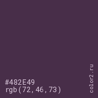 Цвет #482E49 в цветовой модели RGB обозначается тремя октетами (72, 46, 73) в десятичном формате и #482E49 в шестнадцатиричном (hex) формате, которые являются интенсивностью красного 72 (hex 48), интенсивность зелёного 46 (hex 2E) и интенсивность синего 73 (hex 49).