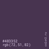 Цвет #483352 в цветовой модели RGB обозначается тремя октетами (72, 51, 82) в десятичном формате и #483352 в шестнадцатиричном (hex) формате, которые являются интенсивностью красного 72 (hex 48), интенсивность зелёного 51 (hex 33) и интенсивность синего 82 (hex 52).