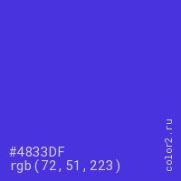 Цвет #4833DF в цветовой модели RGB обозначается тремя октетами (72, 51, 223) в десятичном формате и #4833DF в шестнадцатиричном (hex) формате, которые являются интенсивностью красного 72 (hex 48), интенсивность зелёного 51 (hex 33) и интенсивность синего 223 (hex DF).