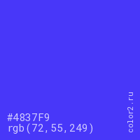 Цвет #4837F9 в цветовой модели RGB обозначается тремя октетами (72, 55, 249) в десятичном формате и #4837F9 в шестнадцатиричном (hex) формате, которые являются интенсивностью красного 72 (hex 48), интенсивность зелёного 55 (hex 37) и интенсивность синего 249 (hex F9).
