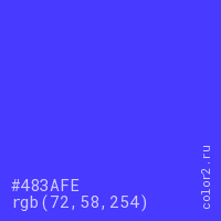 Цвет #483AFE в цветовой модели RGB обозначается тремя октетами (72, 58, 254) в десятичном формате и #483AFE в шестнадцатиричном (hex) формате, которые являются интенсивностью красного 72 (hex 48), интенсивность зелёного 58 (hex 3A) и интенсивность синего 254 (hex FE).