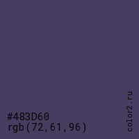 Цвет #483D60 в цветовой модели RGB обозначается тремя октетами (72, 61, 96) в десятичном формате и #483D60 в шестнадцатиричном (hex) формате, которые являются интенсивностью красного 72 (hex 48), интенсивность зелёного 61 (hex 3D) и интенсивность синего 96 (hex 60).