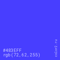 Цвет #483EFF в цветовой модели RGB обозначается тремя октетами (72, 62, 255) в десятичном формате и #483EFF в шестнадцатиричном (hex) формате, которые являются интенсивностью красного 72 (hex 48), интенсивность зелёного 62 (hex 3E) и интенсивность синего 255 (hex FF).