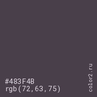 Цвет #483F4B в цветовой модели RGB обозначается тремя октетами (72, 63, 75) в десятичном формате и #483F4B в шестнадцатиричном (hex) формате, которые являются интенсивностью красного 72 (hex 48), интенсивность зелёного 63 (hex 3F) и интенсивность синего 75 (hex 4B).