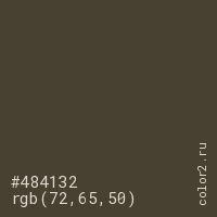 Цвет #484132 в цветовой модели RGB обозначается тремя октетами (72, 65, 50) в десятичном формате и #484132 в шестнадцатиричном (hex) формате, которые являются интенсивностью красного 72 (hex 48), интенсивность зелёного 65 (hex 41) и интенсивность синего 50 (hex 32).