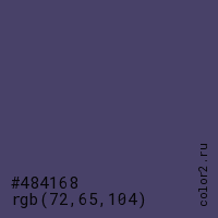 Цвет #484168 в цветовой модели RGB обозначается тремя октетами (72, 65, 104) в десятичном формате и #484168 в шестнадцатиричном (hex) формате, которые являются интенсивностью красного 72 (hex 48), интенсивность зелёного 65 (hex 41) и интенсивность синего 104 (hex 68).
