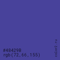 Цвет #48429B в цветовой модели RGB обозначается тремя октетами (72, 66, 155) в десятичном формате и #48429B в шестнадцатиричном (hex) формате, которые являются интенсивностью красного 72 (hex 48), интенсивность зелёного 66 (hex 42) и интенсивность синего 155 (hex 9B).