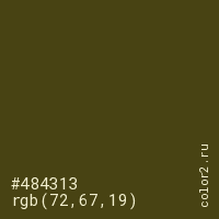 Цвет #484313 в цветовой модели RGB обозначается тремя октетами (72, 67, 19) в десятичном формате и #484313 в шестнадцатиричном (hex) формате, которые являются интенсивностью красного 72 (hex 48), интенсивность зелёного 67 (hex 43) и интенсивность синего 19 (hex 13).