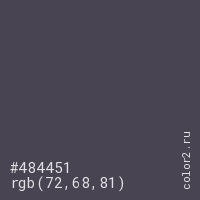 Цвет #484451 в цветовой модели RGB обозначается тремя октетами (72, 68, 81) в десятичном формате и #484451 в шестнадцатиричном (hex) формате, которые являются интенсивностью красного 72 (hex 48), интенсивность зелёного 68 (hex 44) и интенсивность синего 81 (hex 51).