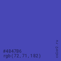Цвет #4847B6 в цветовой модели RGB обозначается тремя октетами (72, 71, 182) в десятичном формате и #4847B6 в шестнадцатиричном (hex) формате, которые являются интенсивностью красного 72 (hex 48), интенсивность зелёного 71 (hex 47) и интенсивность синего 182 (hex B6).