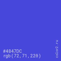 Цвет #4847DC в цветовой модели RGB обозначается тремя октетами (72, 71, 220) в десятичном формате и #4847DC в шестнадцатиричном (hex) формате, которые являются интенсивностью красного 72 (hex 48), интенсивность зелёного 71 (hex 47) и интенсивность синего 220 (hex DC).