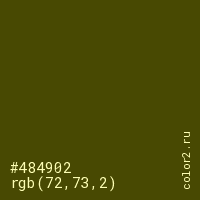 Цвет #484902 в цветовой модели RGB обозначается тремя октетами (72, 73, 2) в десятичном формате и #484902 в шестнадцатиричном (hex) формате, которые являются интенсивностью красного 72 (hex 48), интенсивность зелёного 73 (hex 49) и интенсивность синего 2 (hex 02).