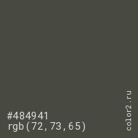 Цвет #484941 в цветовой модели RGB обозначается тремя октетами (72, 73, 65) в десятичном формате и #484941 в шестнадцатиричном (hex) формате, которые являются интенсивностью красного 72 (hex 48), интенсивность зелёного 73 (hex 49) и интенсивность синего 65 (hex 41).
