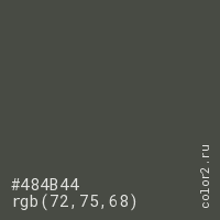 Цвет #484B44 в цветовой модели RGB обозначается тремя октетами (72, 75, 68) в десятичном формате и #484B44 в шестнадцатиричном (hex) формате, которые являются интенсивностью красного 72 (hex 48), интенсивность зелёного 75 (hex 4B) и интенсивность синего 68 (hex 44).
