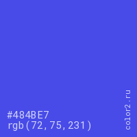 Цвет #484BE7 в цветовой модели RGB обозначается тремя октетами (72, 75, 231) в десятичном формате и #484BE7 в шестнадцатиричном (hex) формате, которые являются интенсивностью красного 72 (hex 48), интенсивность зелёного 75 (hex 4B) и интенсивность синего 231 (hex E7).