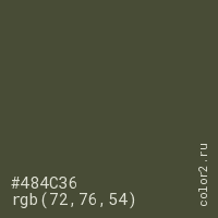 Цвет #484C36 в цветовой модели RGB обозначается тремя октетами (72, 76, 54) в десятичном формате и #484C36 в шестнадцатиричном (hex) формате, которые являются интенсивностью красного 72 (hex 48), интенсивность зелёного 76 (hex 4C) и интенсивность синего 54 (hex 36).