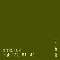 Цвет #485104 в цветовой модели RGB обозначается тремя октетами (72, 81, 4) в десятичном формате и #485104 в шестнадцатиричном (hex) формате, которые являются интенсивностью красного 72 (hex 48), интенсивность зелёного 81 (hex 51) и интенсивность синего 4 (hex 04).