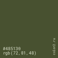 Цвет #485130 в цветовой модели RGB обозначается тремя октетами (72, 81, 48) в десятичном формате и #485130 в шестнадцатиричном (hex) формате, которые являются интенсивностью красного 72 (hex 48), интенсивность зелёного 81 (hex 51) и интенсивность синего 48 (hex 30).