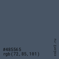 Цвет #485565 в цветовой модели RGB обозначается тремя октетами (72, 85, 101) в десятичном формате и #485565 в шестнадцатиричном (hex) формате, которые являются интенсивностью красного 72 (hex 48), интенсивность зелёного 85 (hex 55) и интенсивность синего 101 (hex 65).