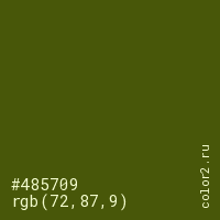 Цвет #485709 в цветовой модели RGB обозначается тремя октетами (72, 87, 9) в десятичном формате и #485709 в шестнадцатиричном (hex) формате, которые являются интенсивностью красного 72 (hex 48), интенсивность зелёного 87 (hex 57) и интенсивность синего 9 (hex 09).