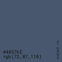 Цвет #48576E в цветовой модели RGB обозначается тремя октетами (72, 87, 110) в десятичном формате и #48576E в шестнадцатиричном (hex) формате, которые являются интенсивностью красного 72 (hex 48), интенсивность зелёного 87 (hex 57) и интенсивность синего 110 (hex 6E).