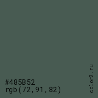 Цвет #485B52 в цветовой модели RGB обозначается тремя октетами (72, 91, 82) в десятичном формате и #485B52 в шестнадцатиричном (hex) формате, которые являются интенсивностью красного 72 (hex 48), интенсивность зелёного 91 (hex 5B) и интенсивность синего 82 (hex 52).