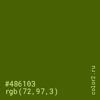 Цвет #486103 в цветовой модели RGB обозначается тремя октетами (72, 97, 3) в десятичном формате и #486103 в шестнадцатиричном (hex) формате, которые являются интенсивностью красного 72 (hex 48), интенсивность зелёного 97 (hex 61) и интенсивность синего 3 (hex 03).