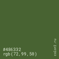 Цвет #486332 в цветовой модели RGB обозначается тремя октетами (72, 99, 50) в десятичном формате и #486332 в шестнадцатиричном (hex) формате, которые являются интенсивностью красного 72 (hex 48), интенсивность зелёного 99 (hex 63) и интенсивность синего 50 (hex 32).
