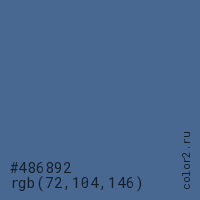 Цвет #486892 в цветовой модели RGB обозначается тремя октетами (72, 104, 146) в десятичном формате и #486892 в шестнадцатиричном (hex) формате, которые являются интенсивностью красного 72 (hex 48), интенсивность зелёного 104 (hex 68) и интенсивность синего 146 (hex 92).