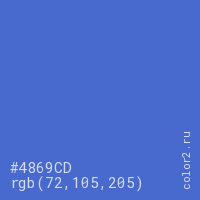Цвет #4869CD в цветовой модели RGB обозначается тремя октетами (72, 105, 205) в десятичном формате и #4869CD в шестнадцатиричном (hex) формате, которые являются интенсивностью красного 72 (hex 48), интенсивность зелёного 105 (hex 69) и интенсивность синего 205 (hex CD).