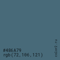 Цвет #486A79 в цветовой модели RGB обозначается тремя октетами (72, 106, 121) в десятичном формате и #486A79 в шестнадцатиричном (hex) формате, которые являются интенсивностью красного 72 (hex 48), интенсивность зелёного 106 (hex 6A) и интенсивность синего 121 (hex 79).