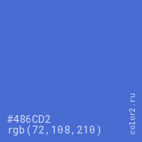 Цвет #486CD2 в цветовой модели RGB обозначается тремя октетами (72, 108, 210) в десятичном формате и #486CD2 в шестнадцатиричном (hex) формате, которые являются интенсивностью красного 72 (hex 48), интенсивность зелёного 108 (hex 6C) и интенсивность синего 210 (hex D2).