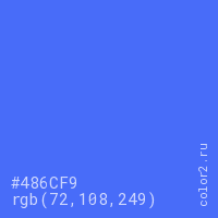 Цвет #486CF9 в цветовой модели RGB обозначается тремя октетами (72, 108, 249) в десятичном формате и #486CF9 в шестнадцатиричном (hex) формате, которые являются интенсивностью красного 72 (hex 48), интенсивность зелёного 108 (hex 6C) и интенсивность синего 249 (hex F9).
